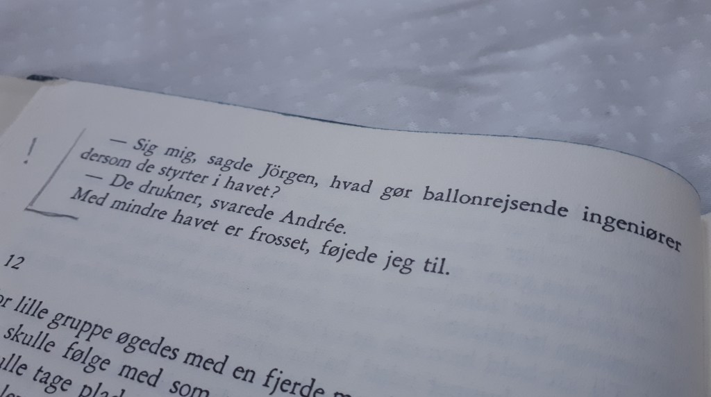 Da jeg nåede den del af bogen, noterede jeg mit eget lille hurraråb med et ”afsted!” i margenen. Opbyggelsen er så vellykket, at også den læser, der kender ekspeditionens skæbne, ikke kan undgå at blive grebet af stemningen. Det er i disse øjeblikke, når man føler, at man deltager i et historisk øjeblik, at Andrées Luftfærd lykkes bedst.